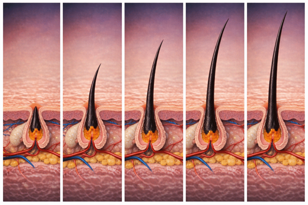 Geduld is essentieel. De haargroeicyclus is een langzaam, natuurlijk proces. Elk haar doorloopt een cyclus van groei (2 tot 6 jaar), rust (2-3 weken) en uitval. Het serum werkt op de haarcellen van binnenuit, en dat kost tijd.